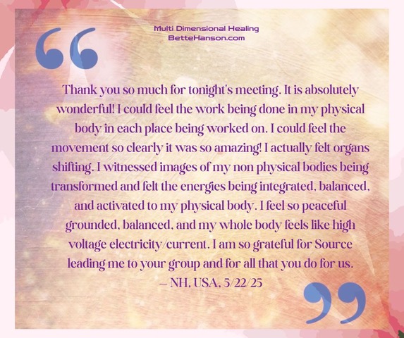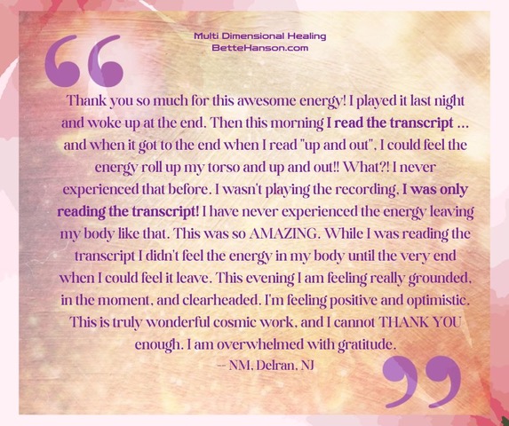 "Bette Hanson is a gifted healer who has helped me access the most uncomfortable parts of myself that were ready to be embraced and transformed. It's heavy lifting, yet I'm left with an overwhelming sense of Peace and Grace." — M.Y., Palm Desert, CA